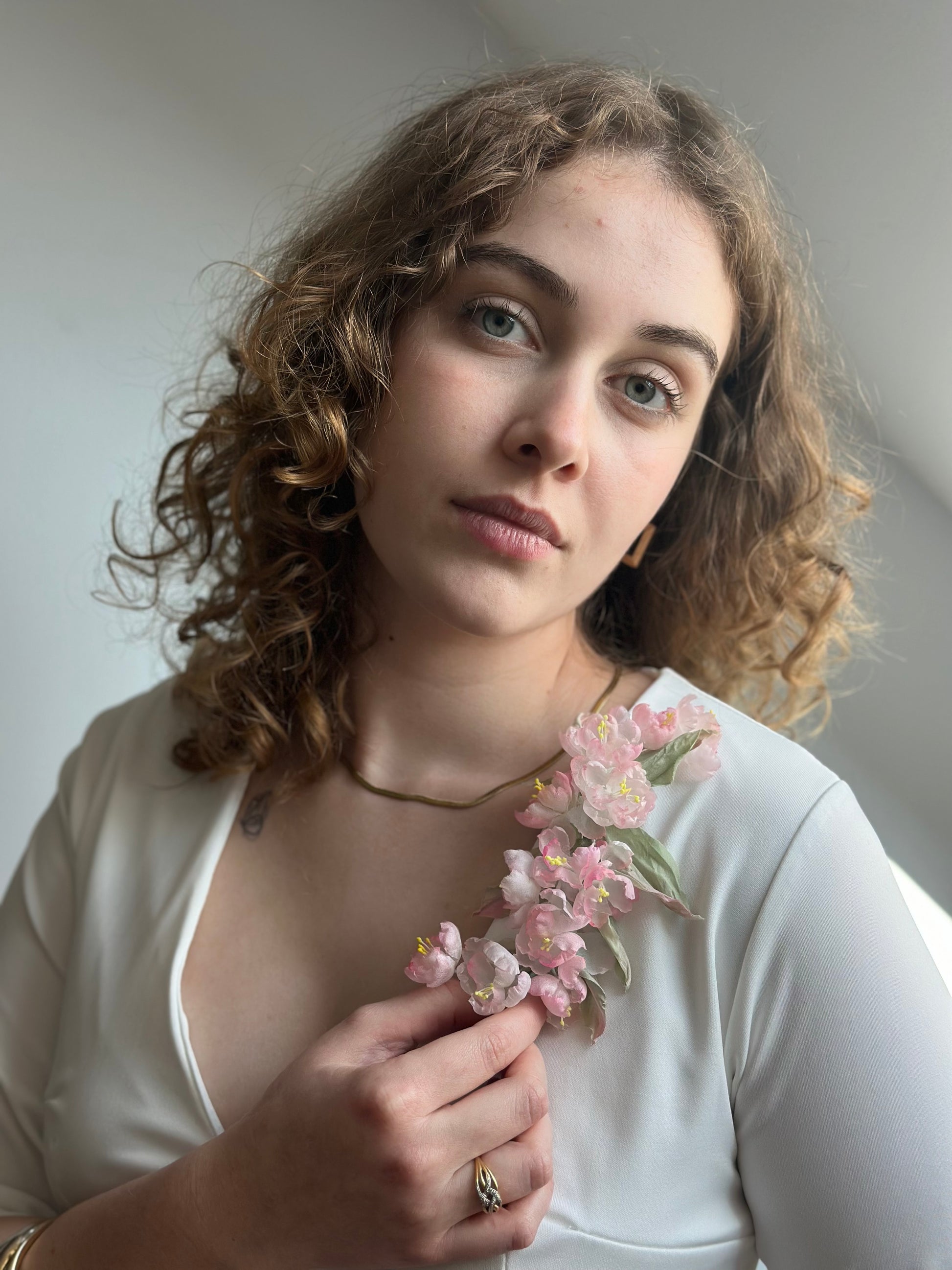 Step into the charm of spring with Blossom Éclat, an exquisite silk apple blossom accessory designed for those who appreciate elegance and craftsmanship. Each flower is meticulously handcrafted and hand-dyed to capture the soft, airy petals of blooming apple blossoms, creating a one-of-a-kind statement piece.