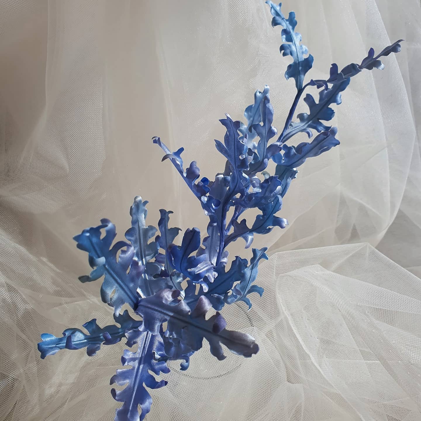 - 3 hand-sculpted clematis flowers in striking blue hues