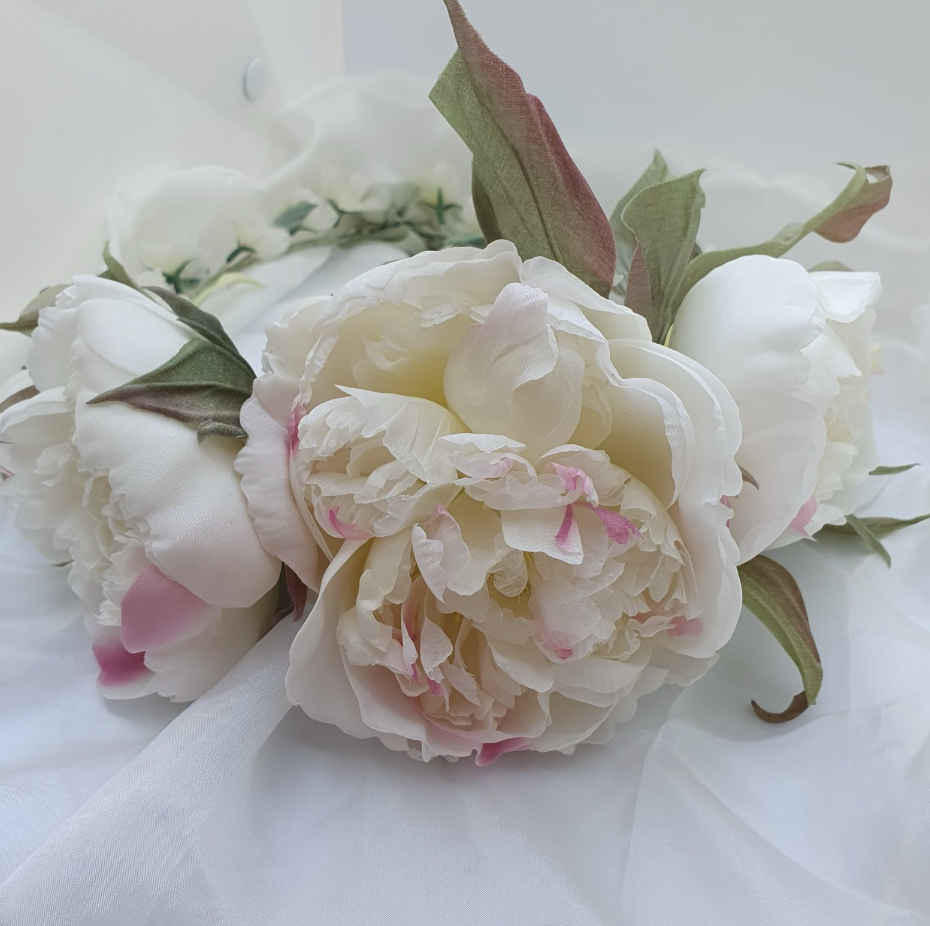 Each headpiece is meticulously handcrafted, with every silk petal shaped and hand-painted to mirror the soft, creamy ivory tones of real peonies, accented with blush pink tips for a touch of natural color. Hand-sculpted, softly tinted green leaves complement the flowers, creating an organic and lifelike aesthetic.